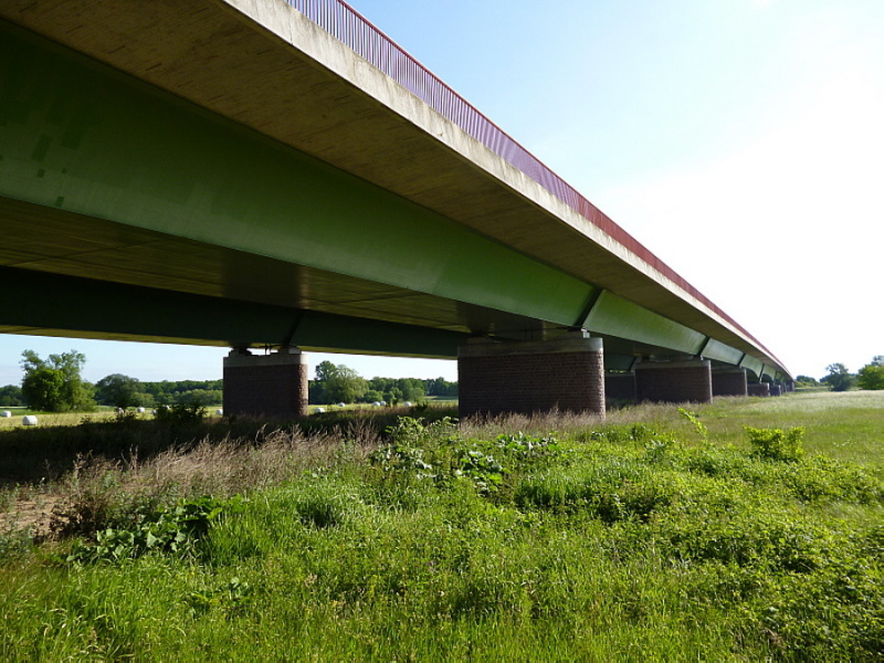 Die Gesamtstützweite des zweiwandigen durchlaufenden Stahlüberbau betrug 654m, die Konstruktionshöhe 3,5 m am Südwiderlager und 4m am Nordwiederlager und stieg linear bis auf 5,5 m direkt über der Elbe an. Neben den zwei Fahrbahnen führte in der Mitte ein Fußweg über die Brücke, dieser konnte über eine Treppe in beiden Widerlagern erreicht werden. Die Bauzeit betrug insgesamt 14 Monate, der am Nordwiderlager zu bauende Aussichtsturm ist unvollendet geblieben da die Versorgung mit Baumaterial nicht sichergestellt werden konnte.