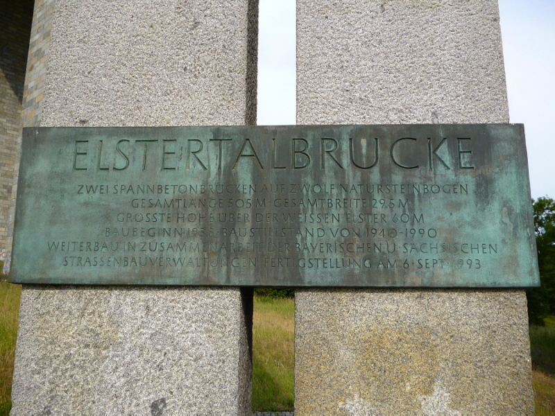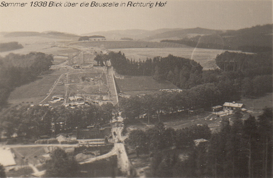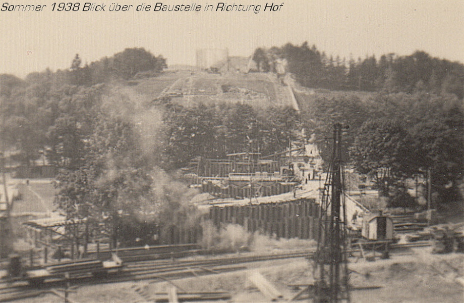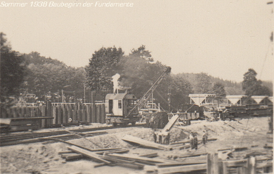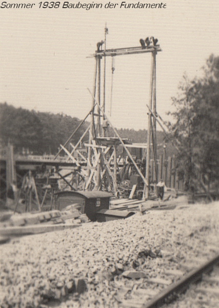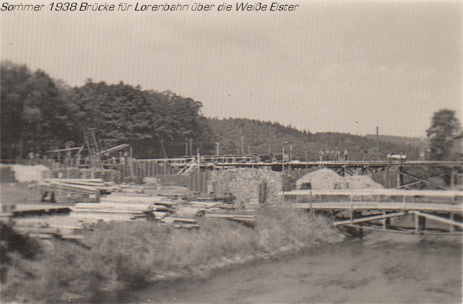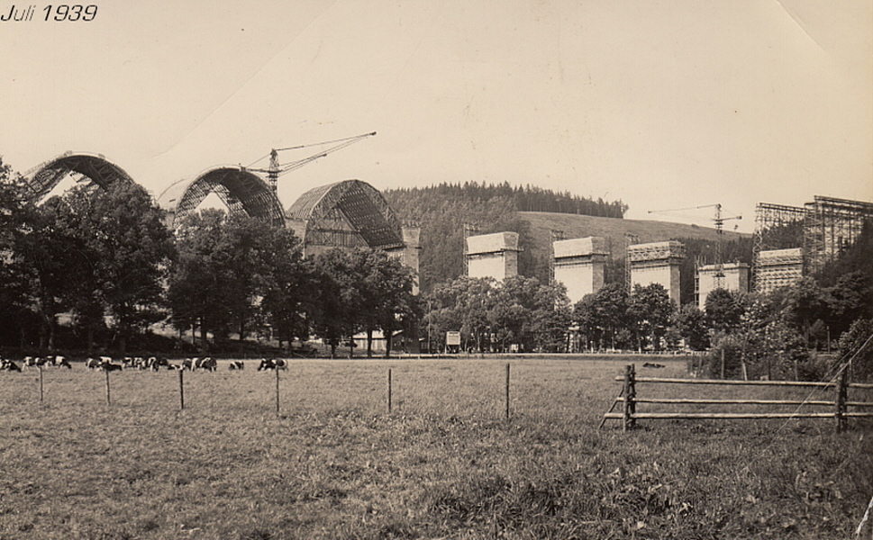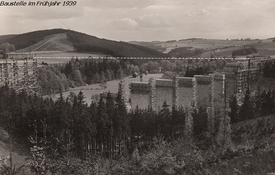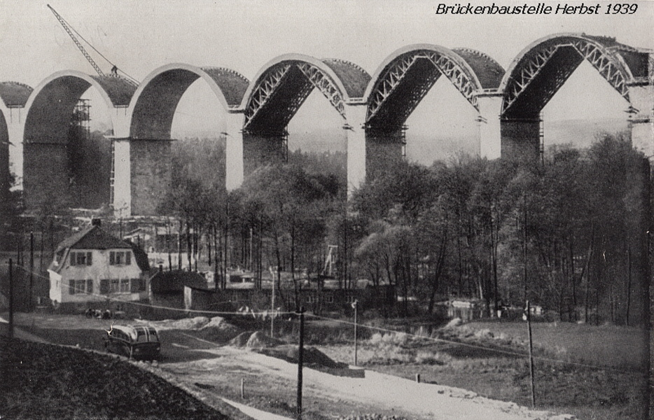 Bereits im Sommer 1938 nehmen die Bauvorbereitungen im Elstertal konkrete Formen an. Zu diesem Zeitpunkt wurden neben der Einrichtung der Baustelle und des Baulagers auch schon mit dem Ausheben der Fundamente begonnen. Offiziell wird der Baubeginn für die Elstertalbrücke jedoch zum Jahresende 1938 angegeben. Mit ihrer Gesamtlänge von 505m und einer maximalen Höhe von 60m über der Weissen Elster sollte sie die Grösste selbstragende Steinbogenbrücke in Europa werden.