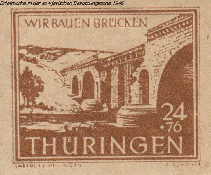 In den letzten Kriegstagen 1945 wurde das Bauwerk gesprengt. 1946 erschien das Motiv der provisorischen wieder aufgebauten Brücke in der sowjetischen Besatzungszone als Briefmarke.
