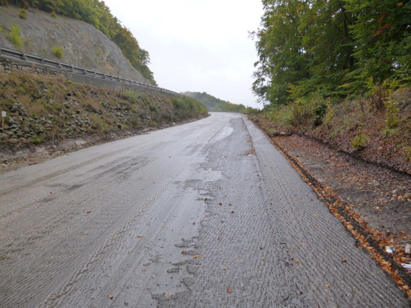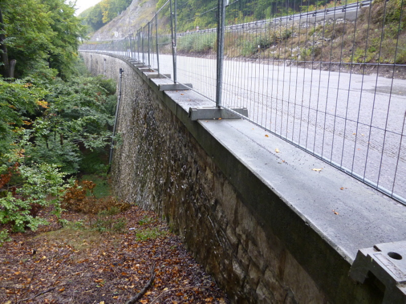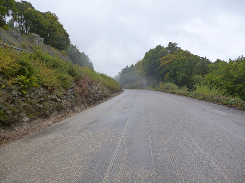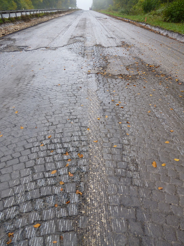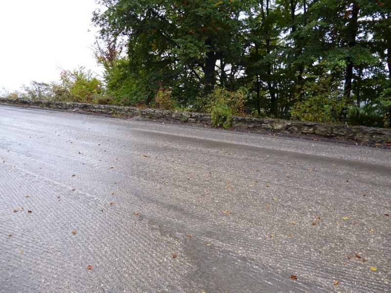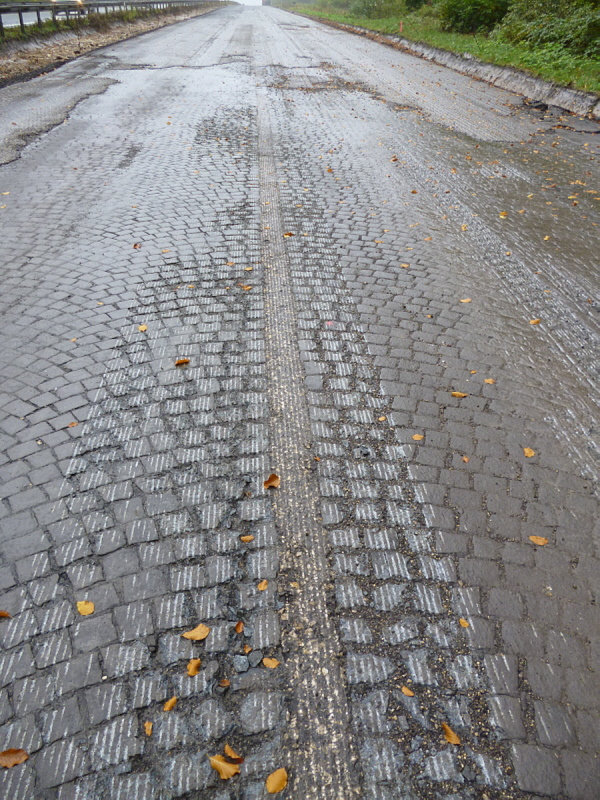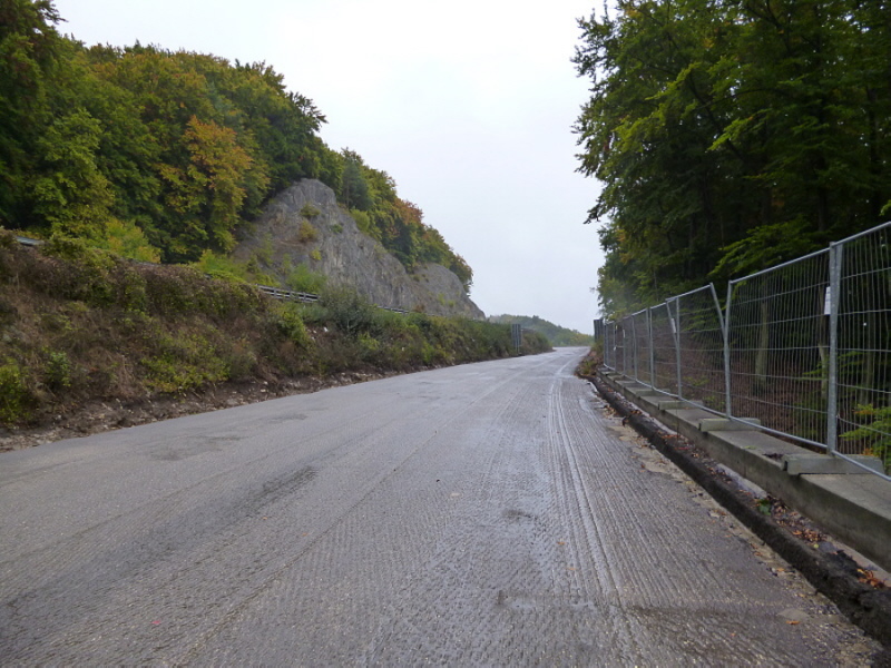 Die Fahrbahn ist aber nicht mehr komplett vorhanden. 1979 wurden die inneren Randsteine und die mittleren Schlackesteine mit der weißen Fahrbahnmarkierung entfernt.
