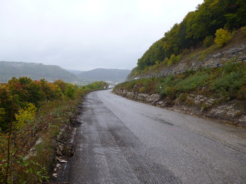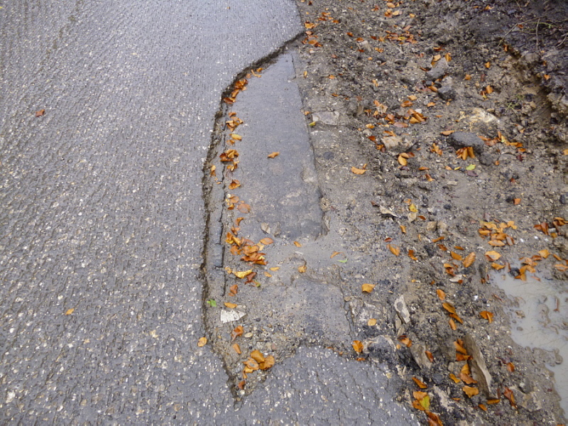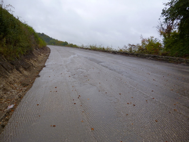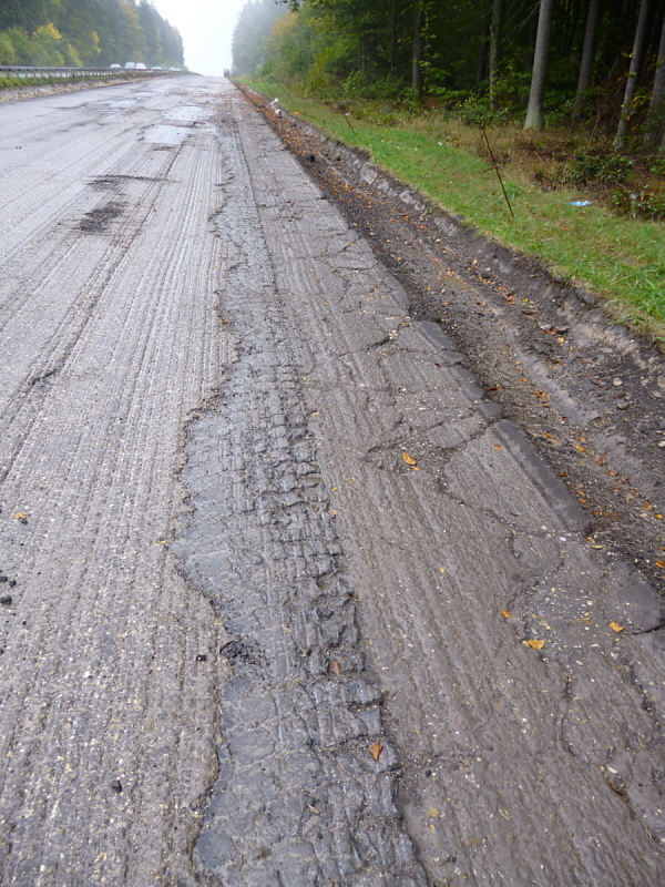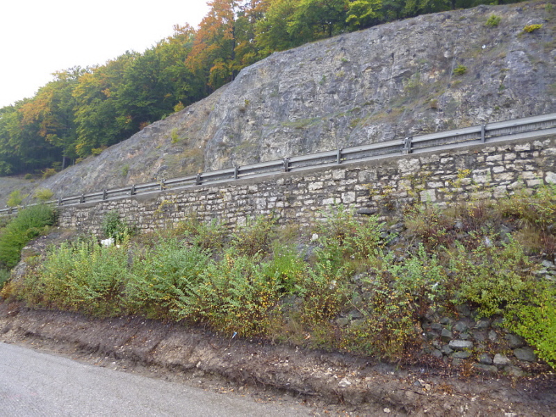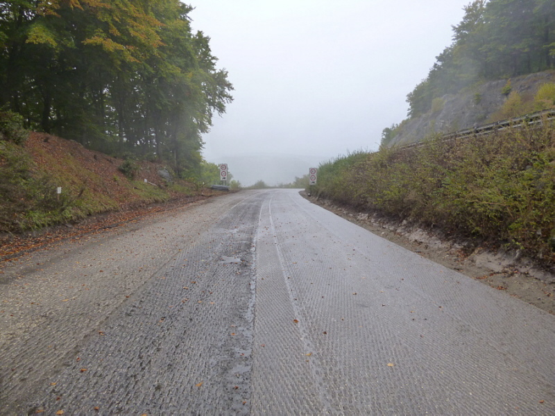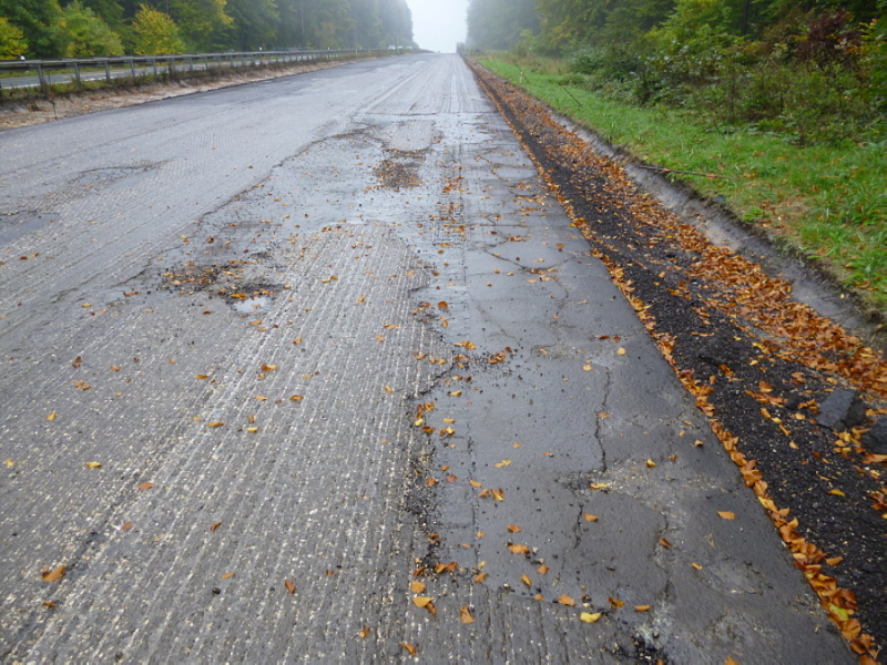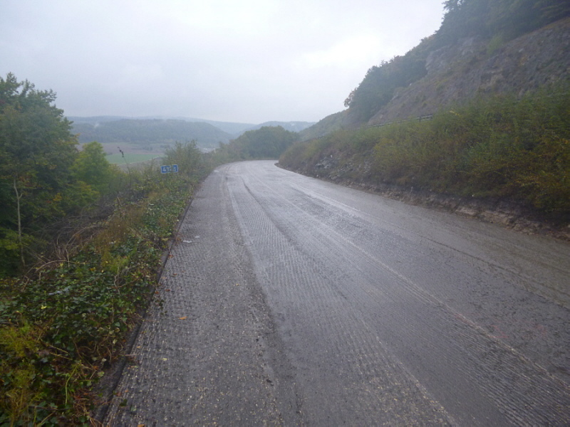 Die Fahrbahn ist aber nicht mehr komplett vorhanden. 1979 wurden die inneren Randsteine und die mittleren Schlackesteine mit der weißen Fahrbahnmarkierung entfernt.